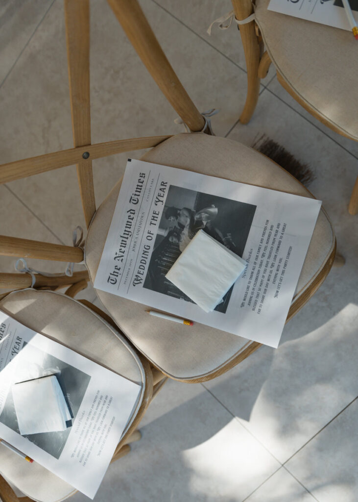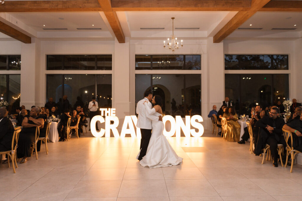 The design elements were minimal but powerful. White florals softened the space with texture, while marquee letters added just the right touch of playful romance. The black-and-white theme ran through every detail—from the stationery to the table settings—and tied the celebration together with intention.