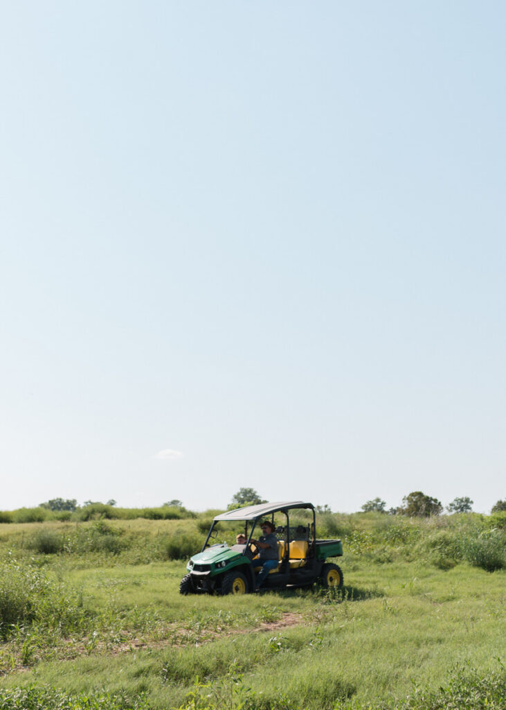 We loaded into a cart and drove to the edge of the property — away from the main buildings, past the open pasture, toward the river. The red clay hills framed the horizon. The water moved slowly behind them.