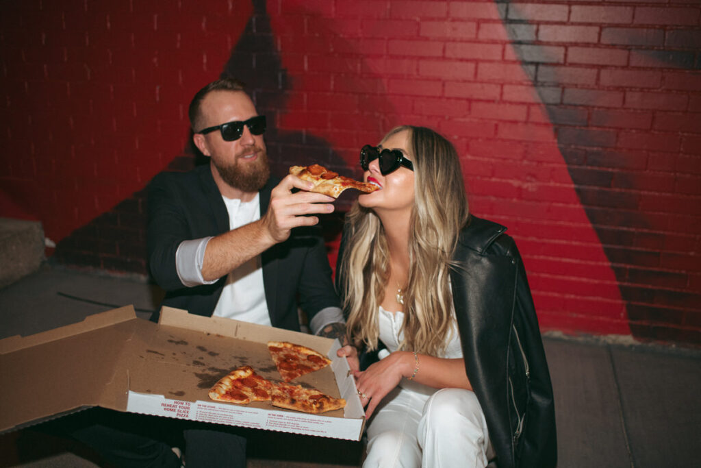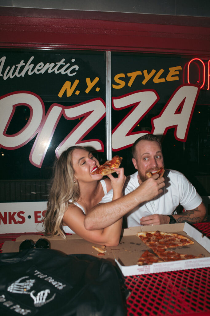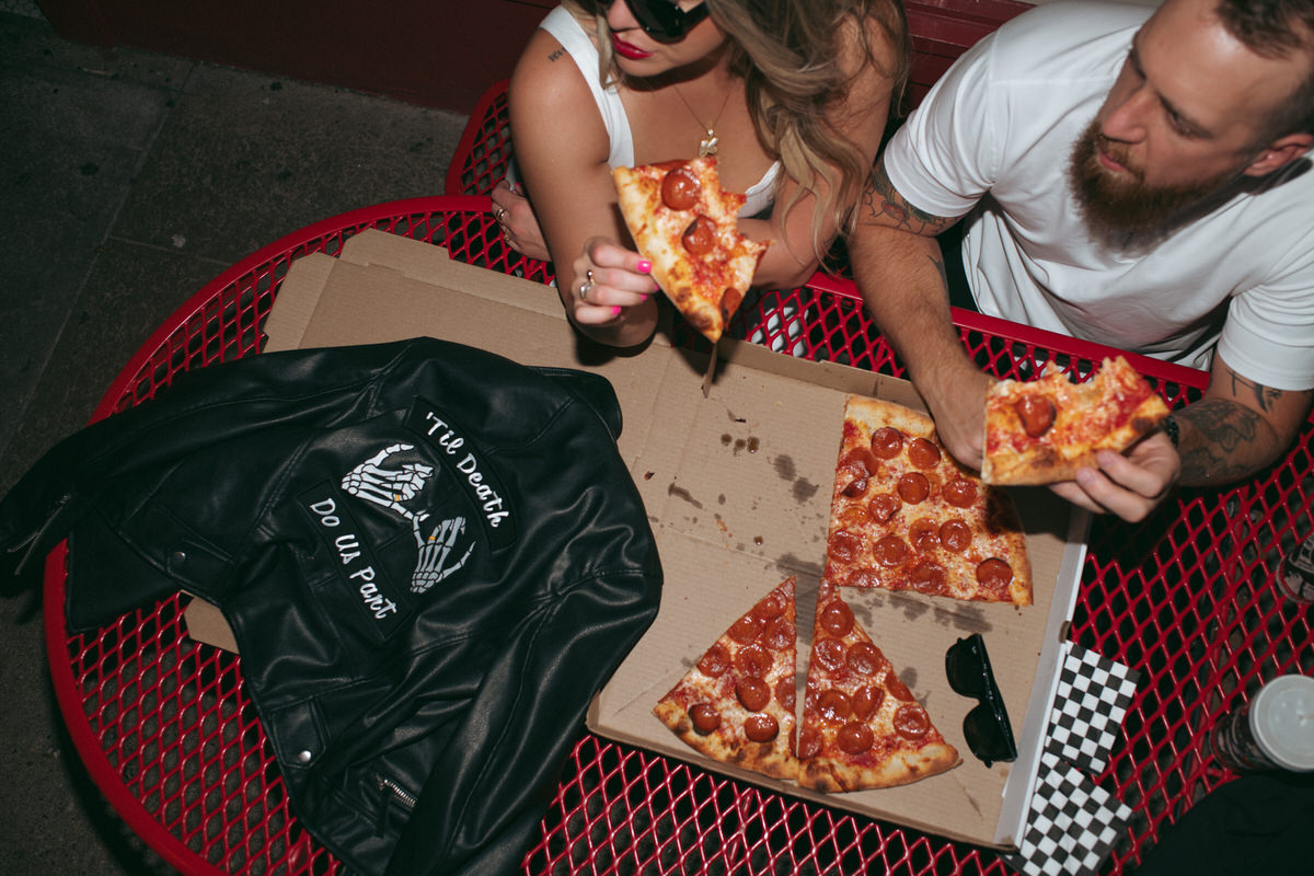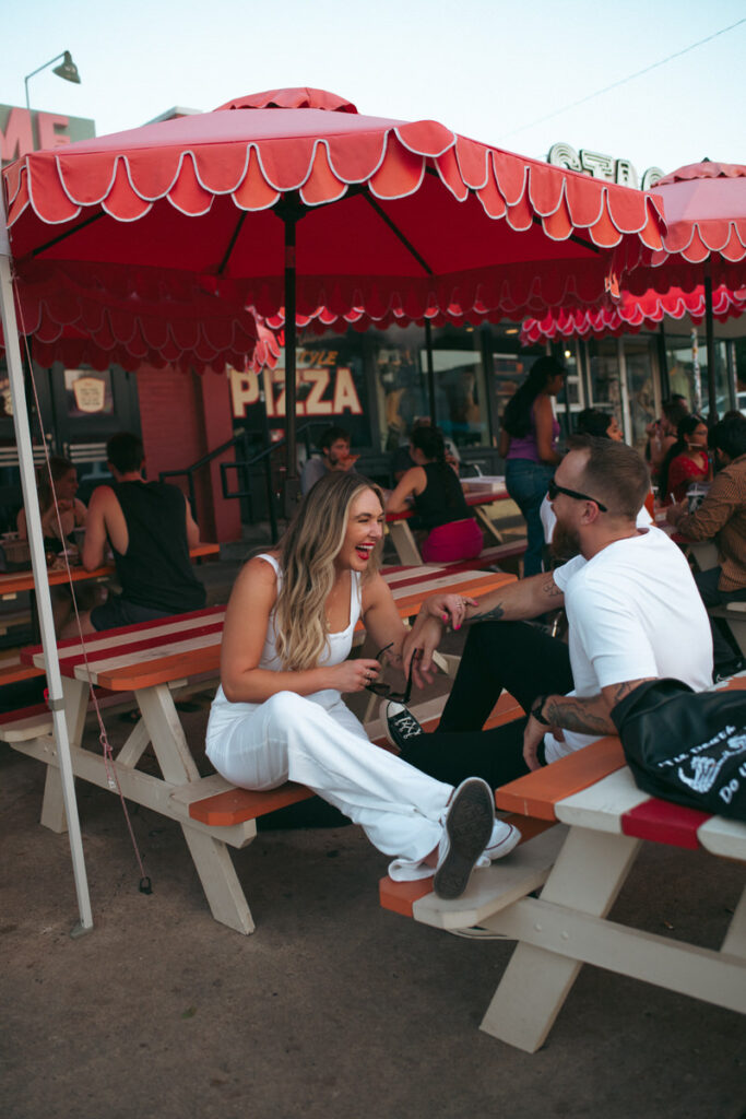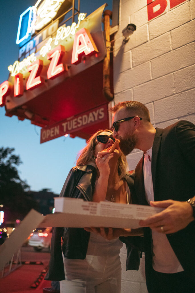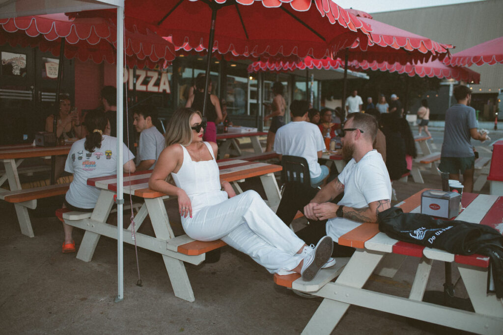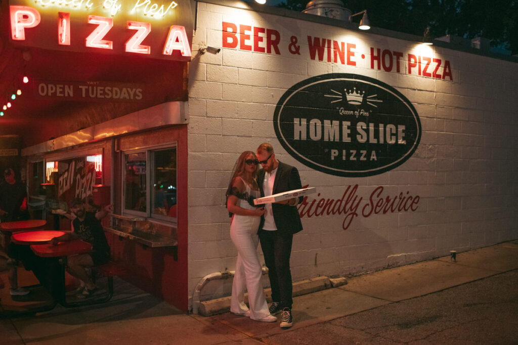 After a few quick frames at the motel, we walked to Home Slice Pizza — because why not make a pit stop mid-session? They grabbed a full box and waited in the outdoor seating area, surrounded by a crowd of people, all talking, eating, living their lives.
