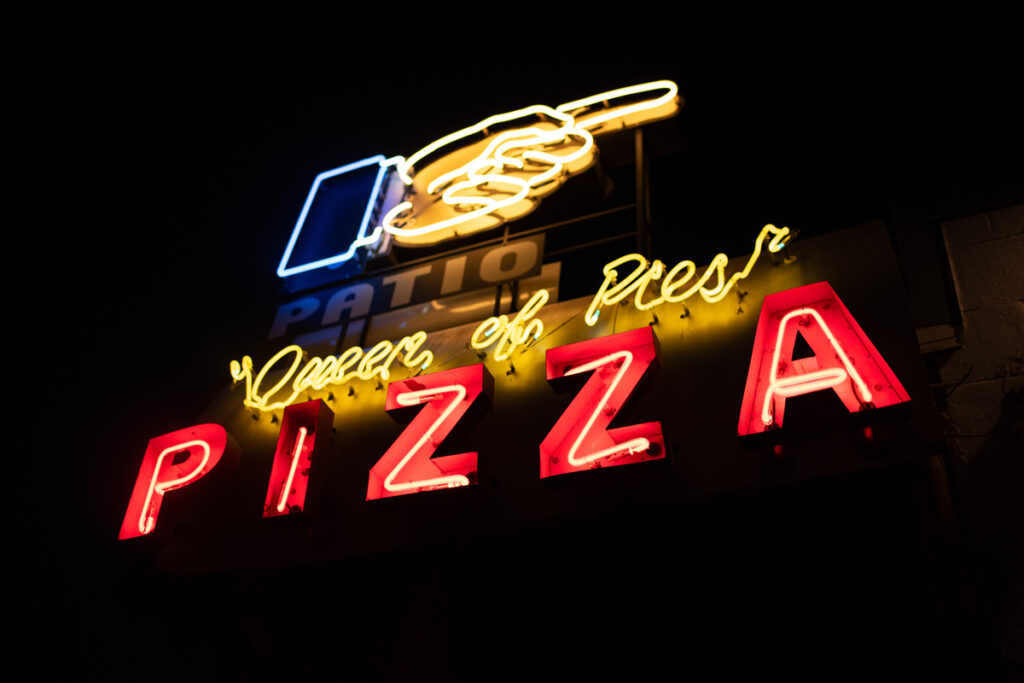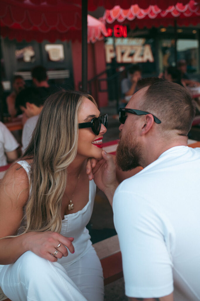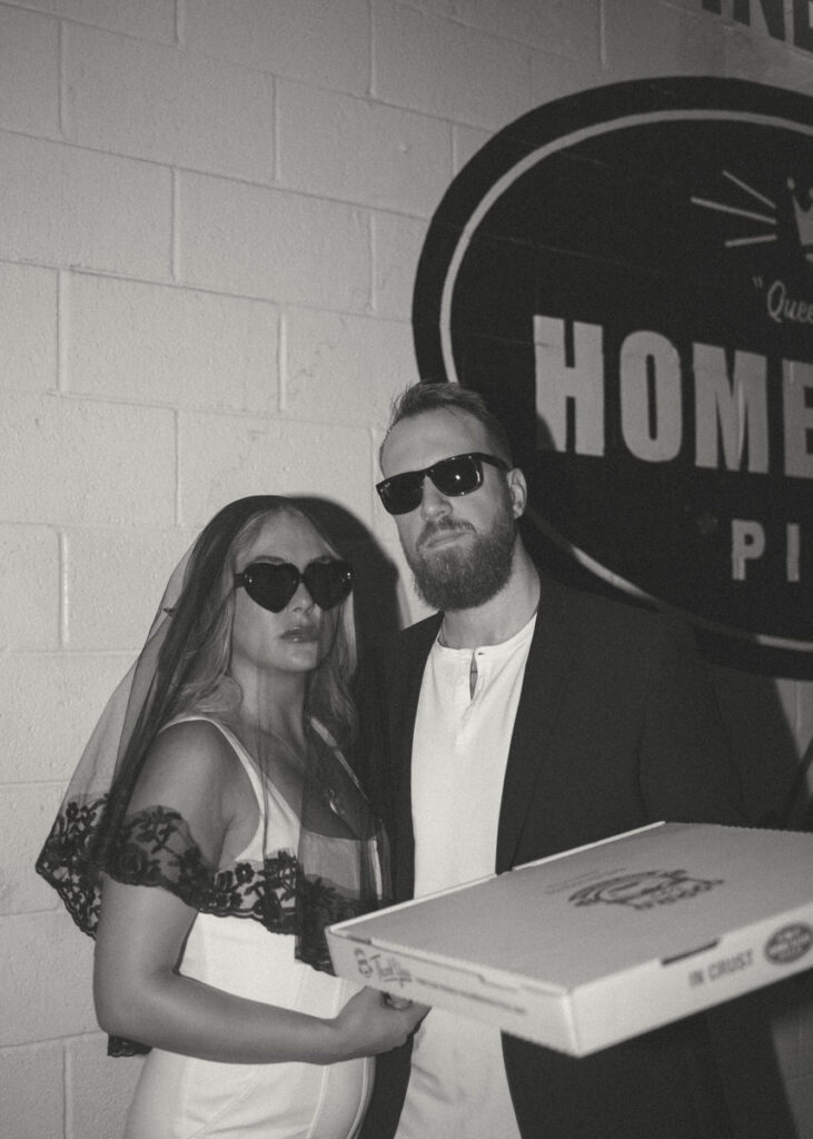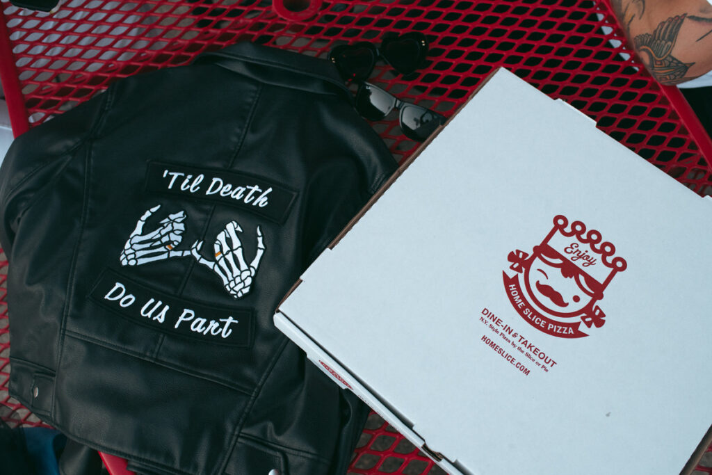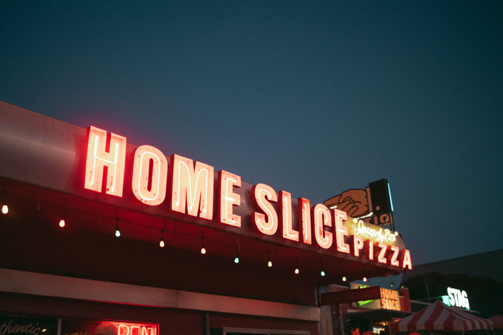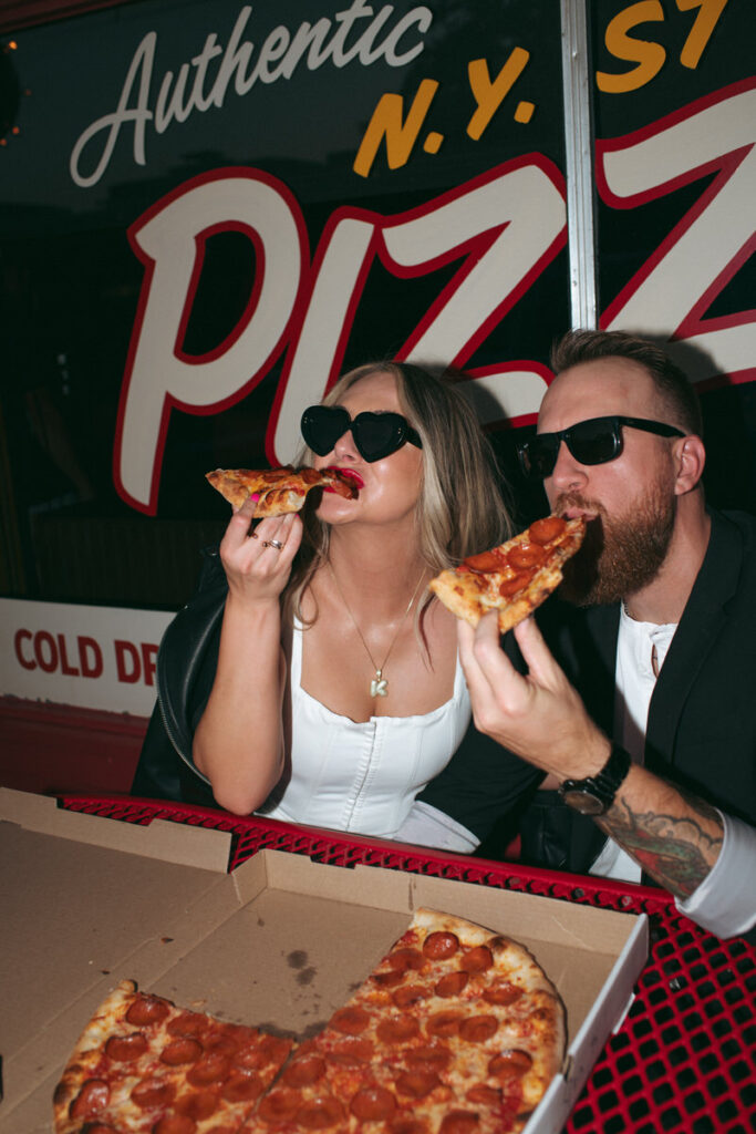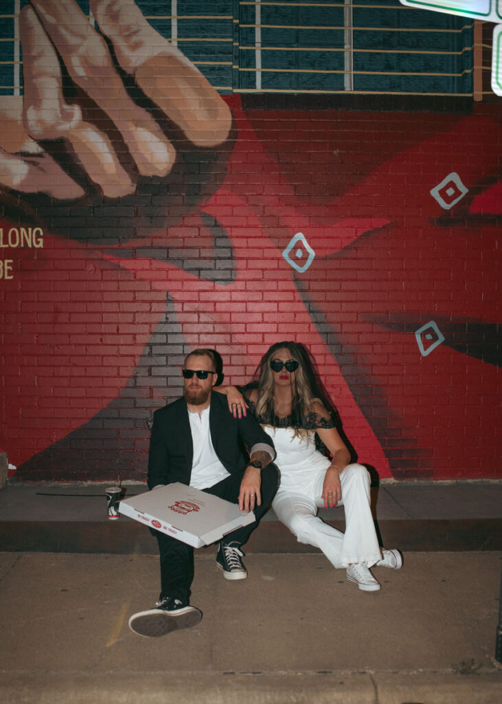 After a few quick frames at the motel, we walked to Home Slice Pizza — because why not make a pit stop mid-session? They grabbed a full box and waited in the outdoor seating area, surrounded by a crowd of people, all talking, eating, living their lives.