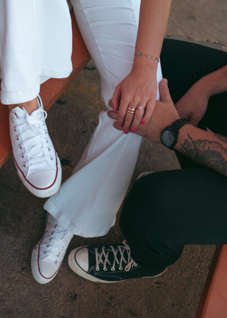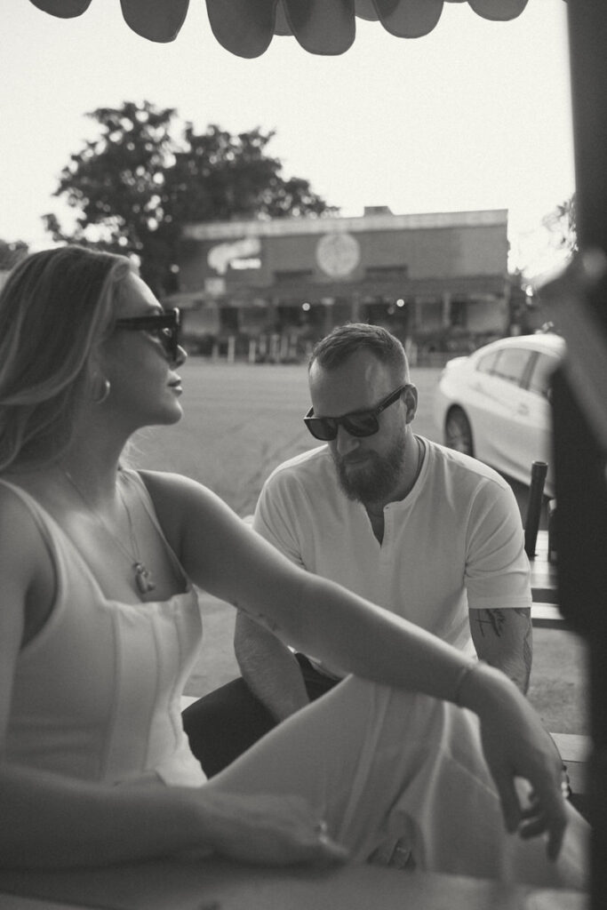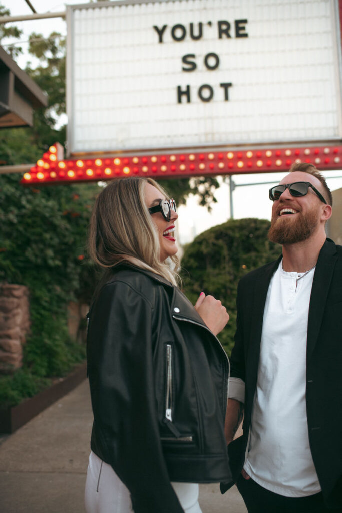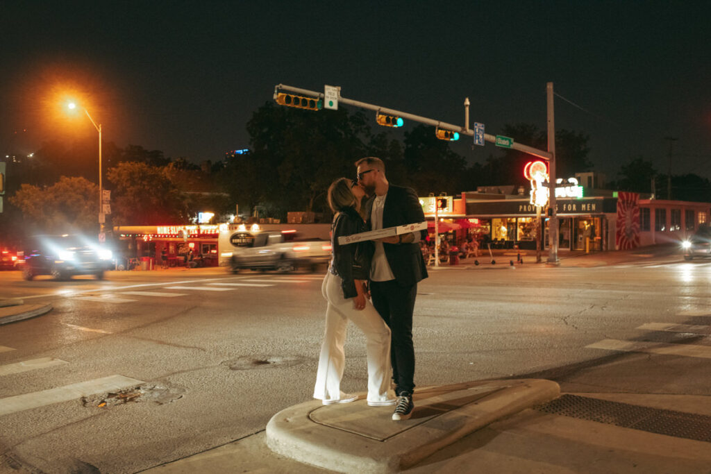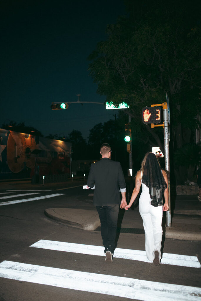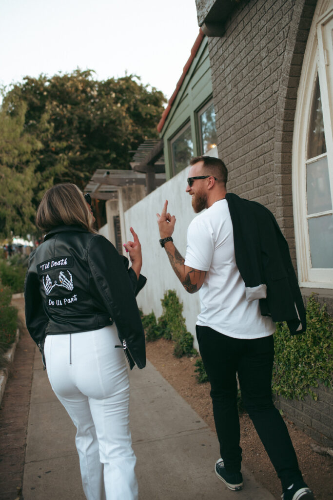 This couple came ready with black and white outfits, custom leather jackets, and a bold energy that didn’t need a quiet backdrop to shine. South Congress was buzzing — locals, tourists, music in the air — and somehow, they still felt like the center of it all.