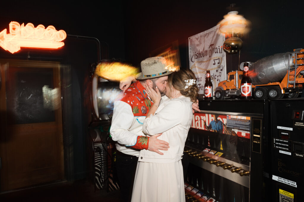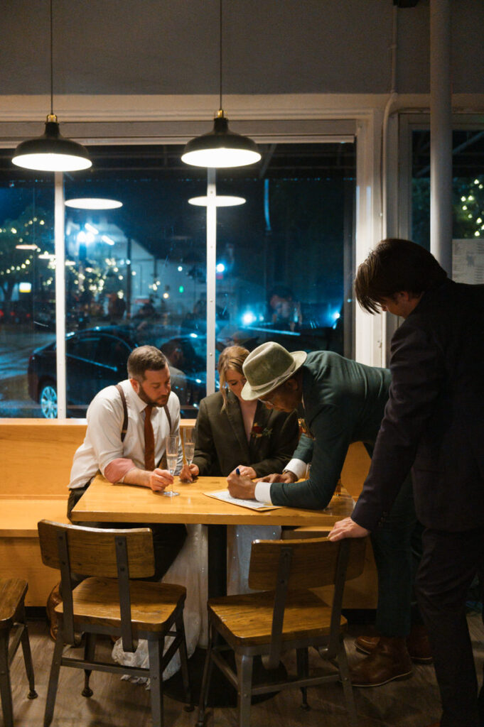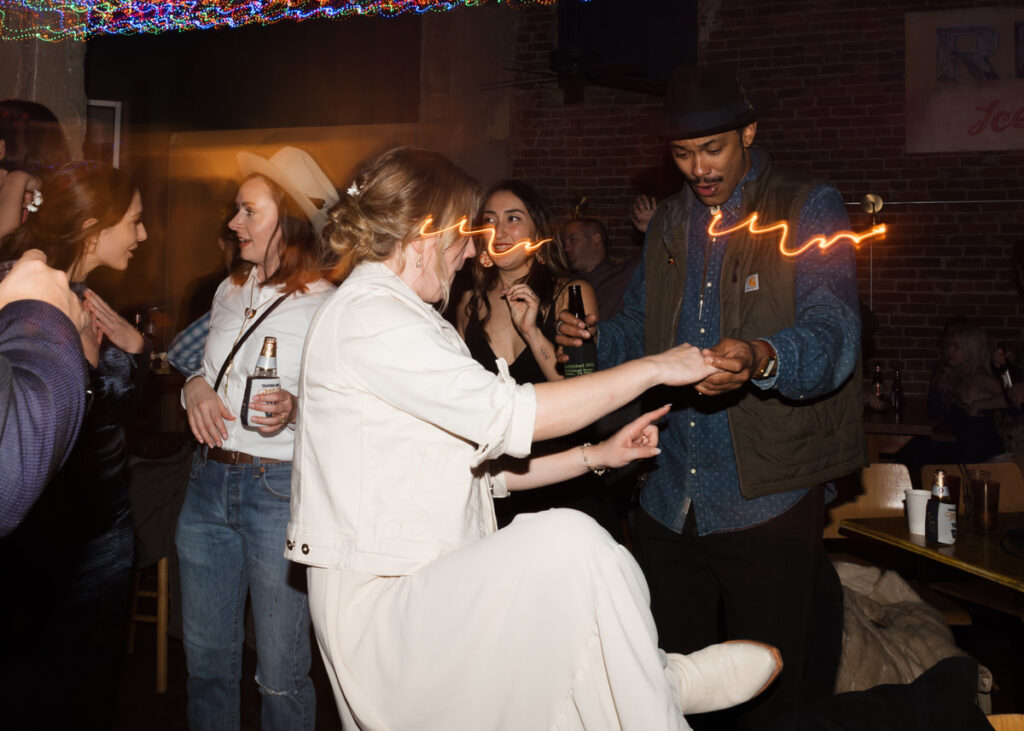 After the ceremony, dinner took place in an upstairs space above a restaurant in downtown Lockhart — intimate, low-lit, and full of laughter. Guests leaned into the vibe. Outfits were next-level, conversation flowed, and every little detail felt intentional but never overdone.