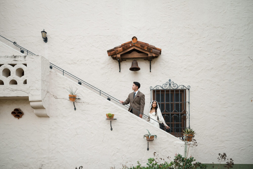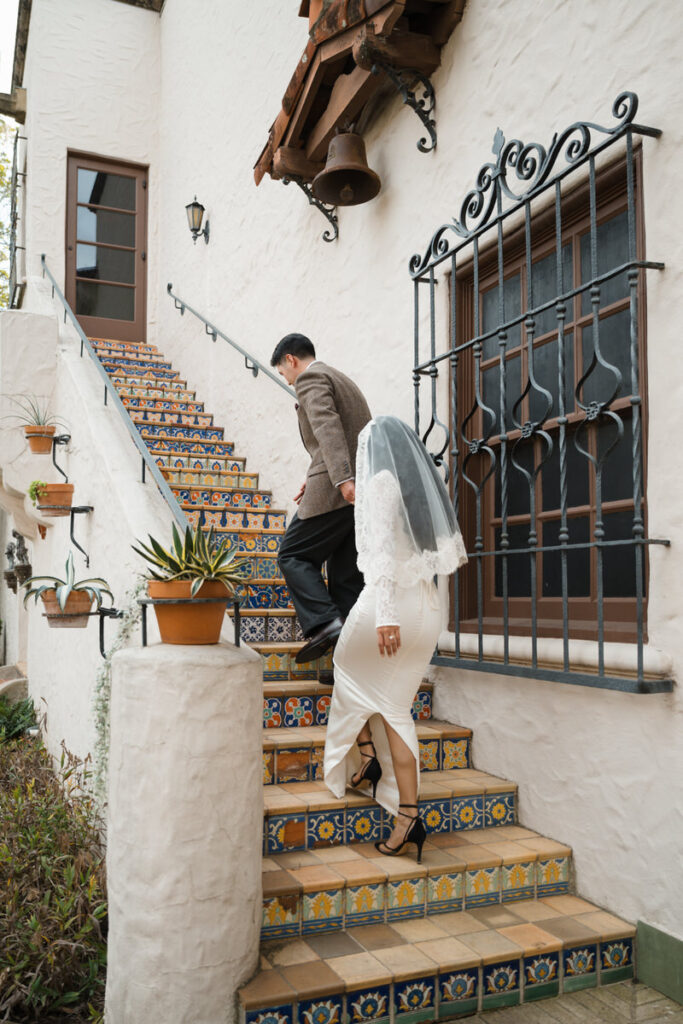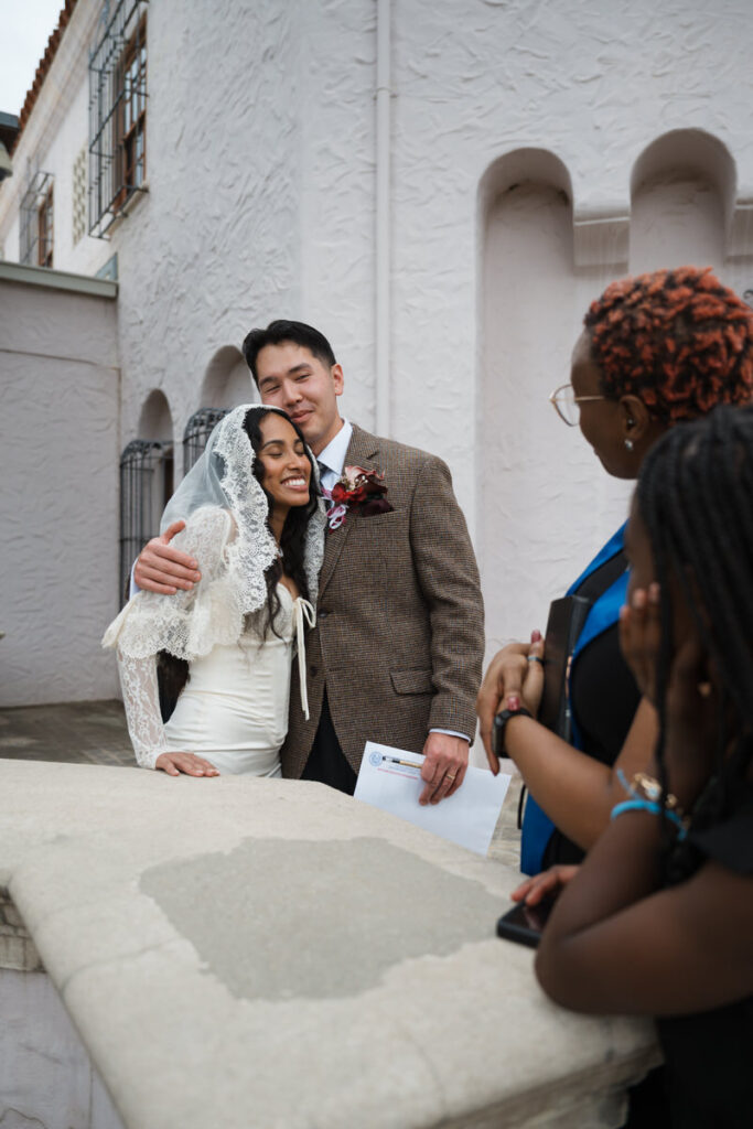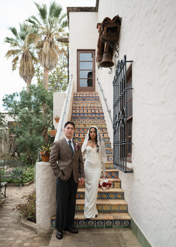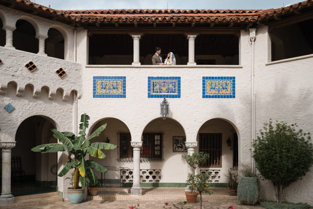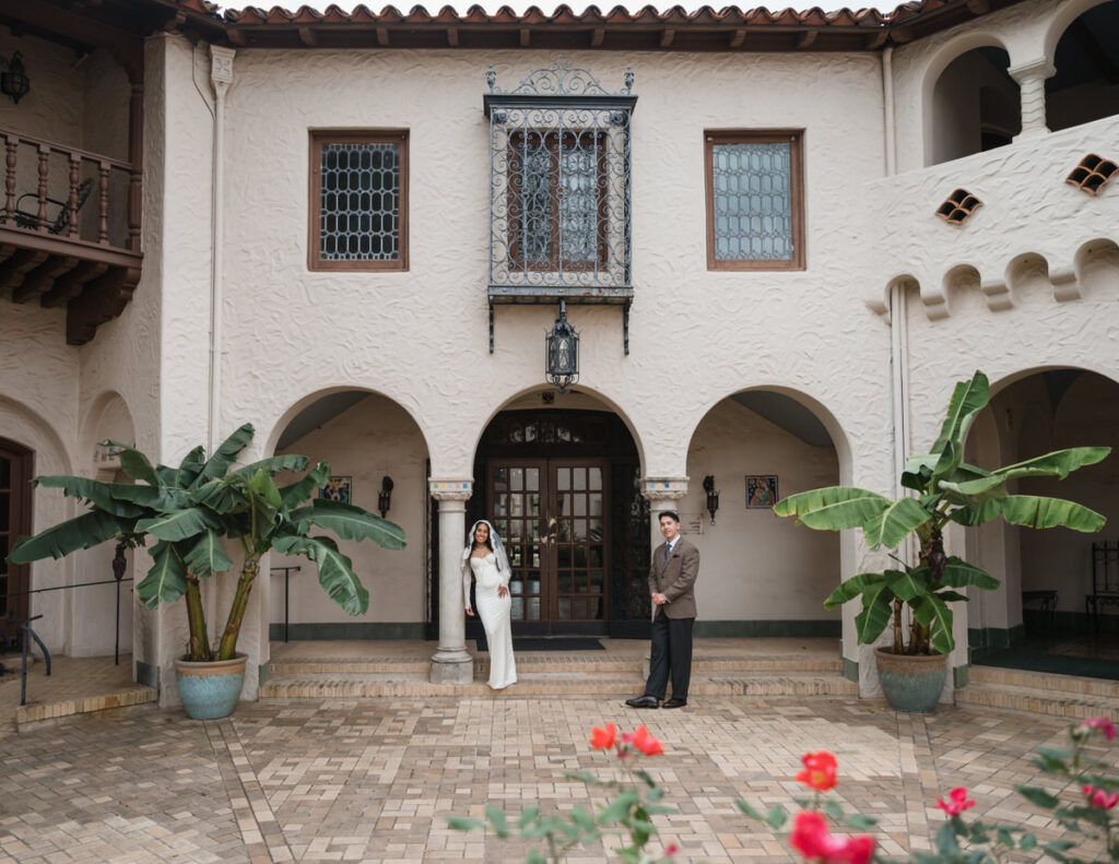 They chose to elope in front of the museum — surrounded by arches, greenery and grandeur.