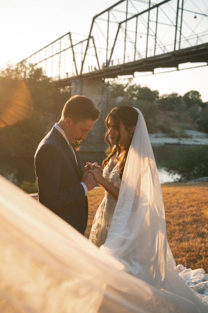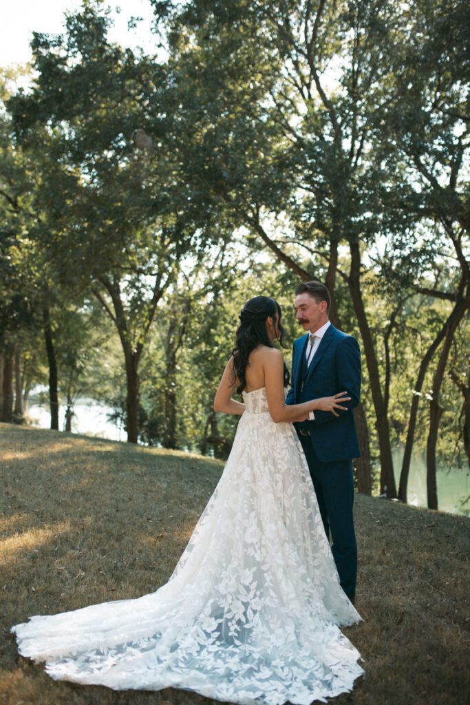 Bella and Taylor chose a ceremony location that was truly breathtaking — right by the river near Faust Street Bridge in New Braunfels. The water flowed quietly behind them as they exchanged vows under open skies, surrounded by tall trees and soft light.