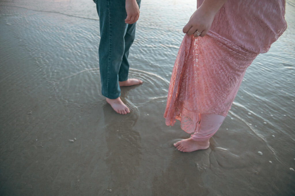 She wore a long, flowy blush-toned dress that moved with the breeze. He wore a pale neutral colored shirt and jeans, casual but clean. It all felt intentional without being forced — simple, calm, and exactly what a beach morning should feel like.