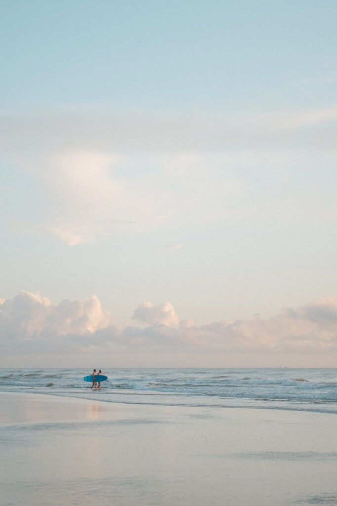 As we walked the shore, the light shifted. That soft gold glow crept in, and we caught it just as it reflected back on the wet sand — turning their silhouettes into mirrored versions of themselves.
