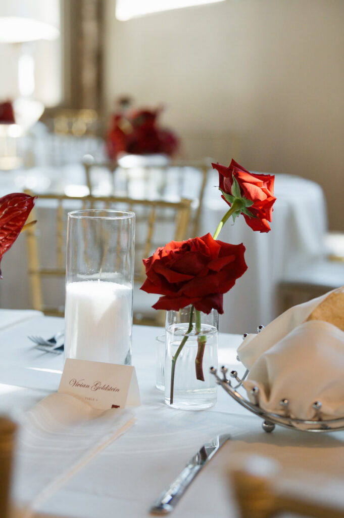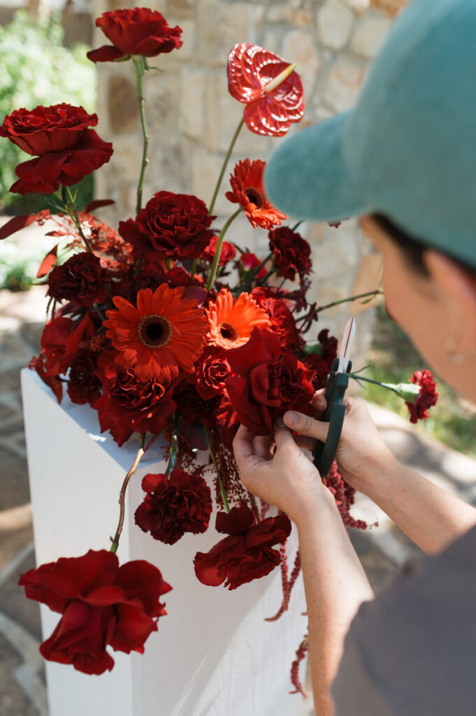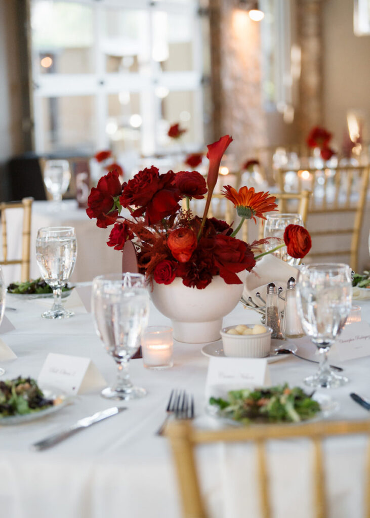Their color palette centered on multiple tones of red — deep crimson, berry, and wine. Those shades appeared in florals, reception accents, and small design details that tied everything together.
