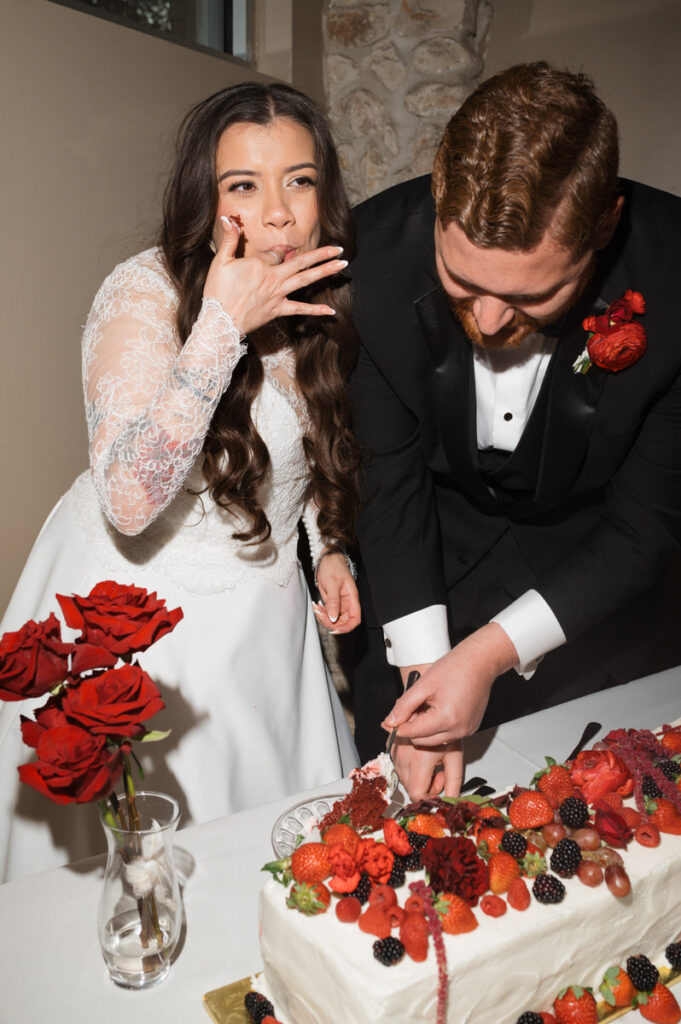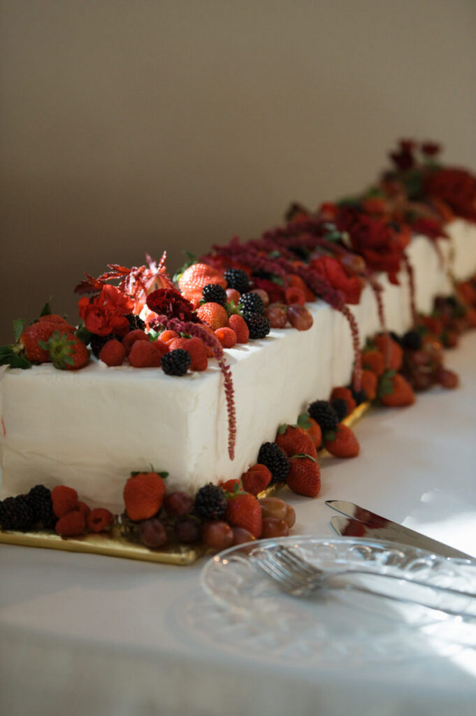 Instead of a tiered cake, they chose a long sheet-style design topped with clusters of red berries. It stretched across the table and carried the same red tones seen earlier in the day.